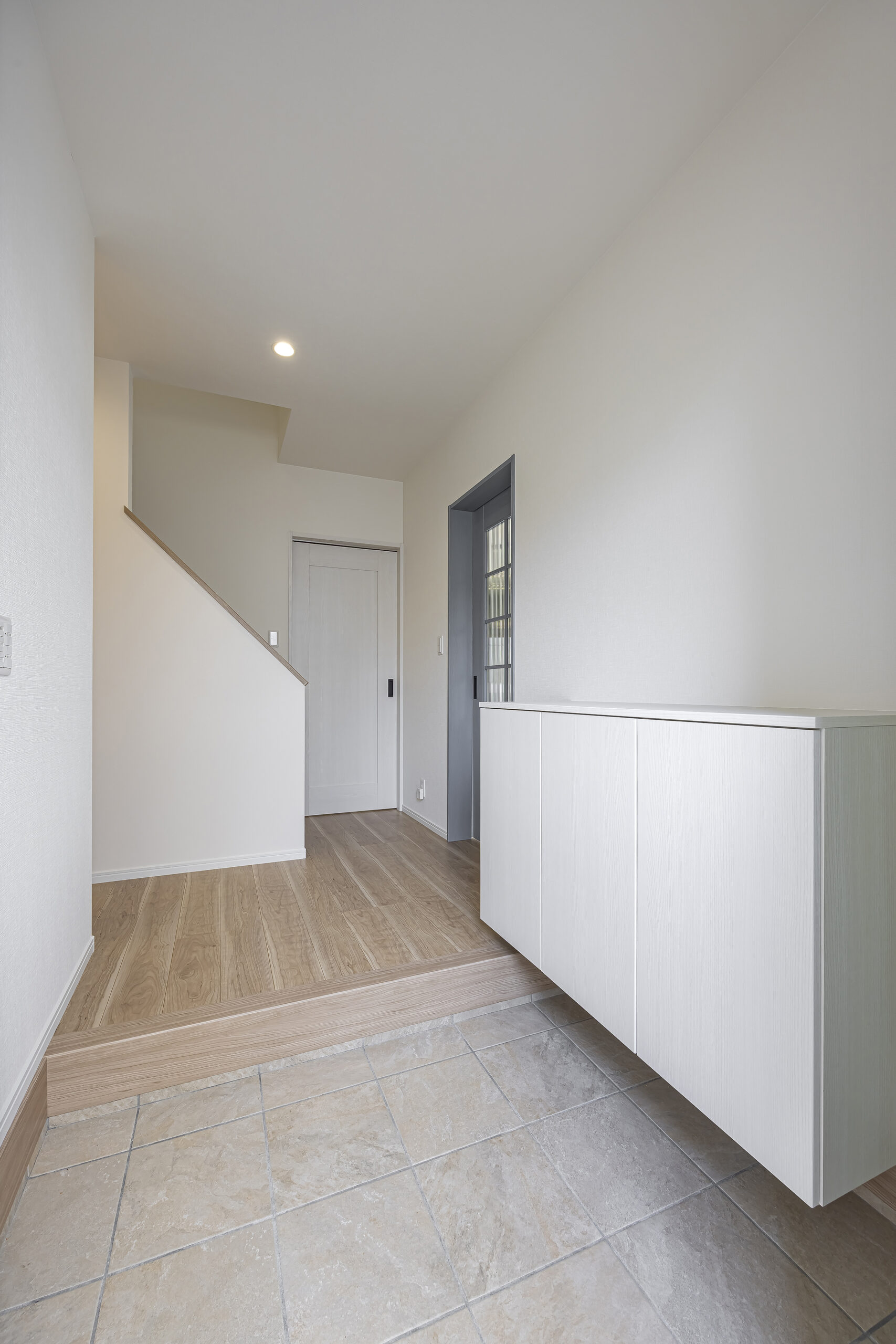 • 玄関ホールは、飽きのこない暖色系シンプルな色合いで仕上げました。リビングの入口は、ワンポイントのアクセント色のドアを採用されました。