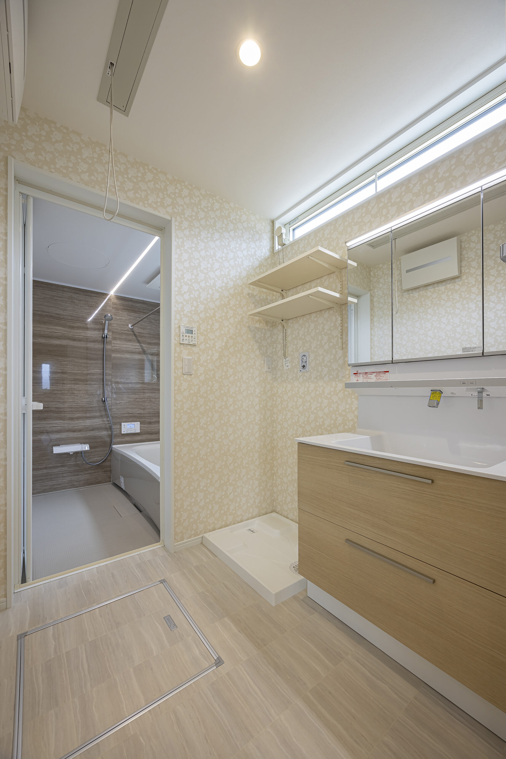 • キッチンから一直線の洗面所~お風呂で、家事動線が最短距離にレイアウトしました。洗面所の天井には室内干し用の埋込収納の物干し。