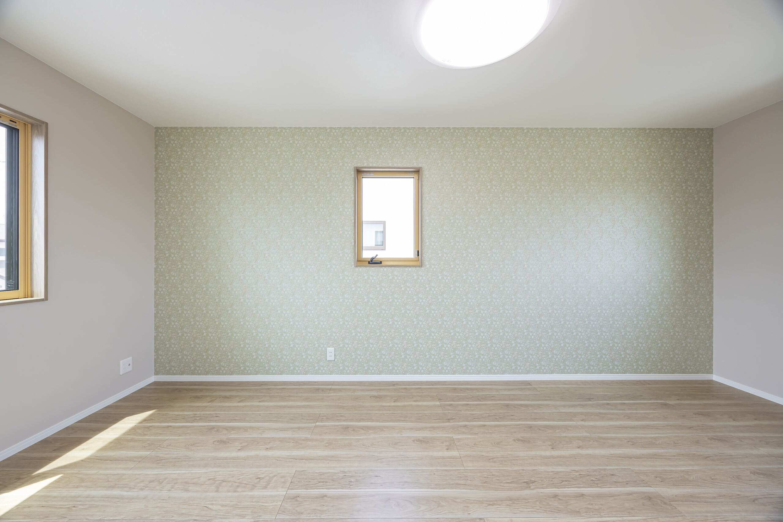 • 主寝室はゆったり9帖。アクセント壁は、落着く暖色系でフロアーは明るめの木目色で仕上げました。